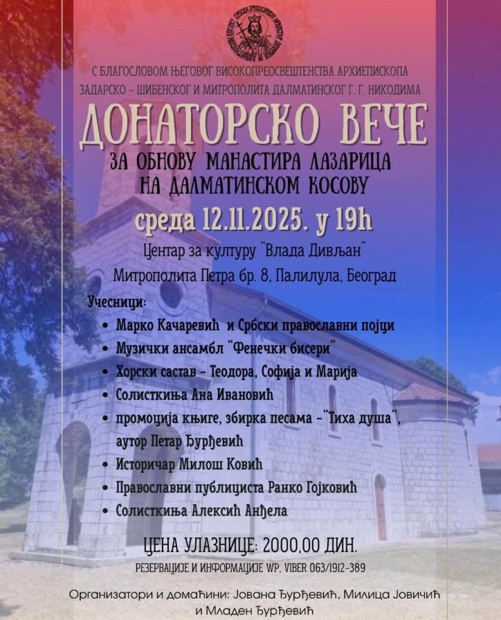 С благословом Његовог високопреосвештенства Архиепископа Задарско-шибенског и Митрополита далматинског г. г. Никодима, позивамо вас на донаторско вече за обнову Манастира Лазарица на Далматинском Косову, које ће се одржати у среду, 12. новембра 2025. године у 19 часова у Центру за културу „Влада Дивљан“ (Митрополита Петра бр. 8, Палилула, Београд).