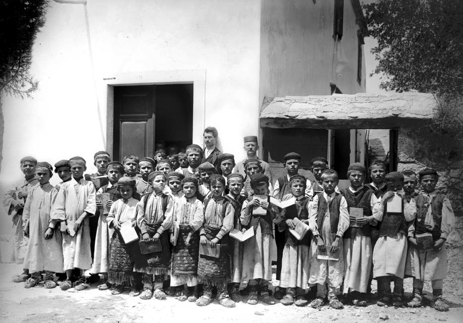 Ђаци са учитељем испред школе у Ђеврскама, 1904. Фотограф: др Радивоје Симоновић Богдан Шекарић (2019), Фотографије др Радивоја Симоновића. Књига друга – Велебит. Нови Сад..
