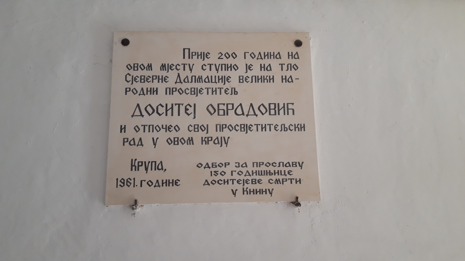 Први српски министар просвете Доситеј Обрадовић како је написао, после него је „прешао Вучјак планину“ и прешао из Лике у Далмацију, кратко је боравио у овом манастиру (пролеће 1761). Одатле су га крупски монаси упутили да буде учитељ у српским селима Книнске крајине где учитеља, до тада није било или их је било веома мало. У Крупи је, стотинак година касније, Симо Матавуљ, будући велики српски књижевник, провео три или четири године после шест разреда ниже шибенске Гимназије. Отишао је код свог стрица игумана, спремао се за калуђера али је одустао и уписао се у задарску Препарандију (учитељска школа) после које је неколико година био учитељ у српским далматинским селима Ђеврске и Ислам Грчки. Исаија Олујић (1823-1902), познат као архимандрит Исаија, касније је био професор Богословије у Задру. Архимандрит Исаија је забележио: „Просветна активност манастира Крупе имала је у разна времена и разне облике рада. Од постанка манастиревог до данас, одгајају се у њему младићи у читању, појању, типику, писању, а неки и у другим црквеним наукама. Поред овог одгоја... 8. новембра 1846. овдје је створена била мања, основна помоћна српска школа са 12 дјеце“. Пише и да су некад „трговци и властела из градова и вароши" слали братији у манастир јестива, нарочито поснога (из Грачаца су слали и просфоре) и гостили братију кад би ко тамо долазио. Игуман Павле Козлица бринуо је, као о својој кући, о овом манастиру у тешким годинама после Другог светског рата, а међу последњим избеглицама - старцима пренет је (дословно готово на рукама) у манастир Жичу у Србији, одатле су враћени његови посмртни остаци да од 2009. године почивају у порти Крупе.